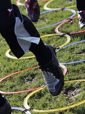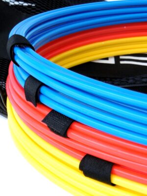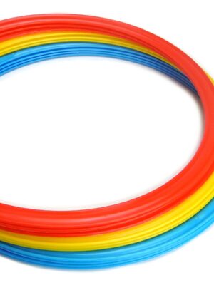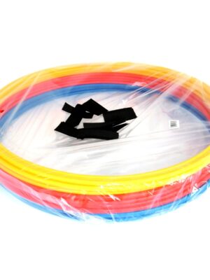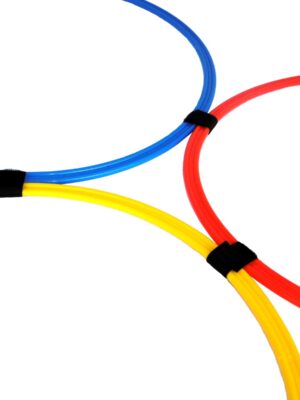 Obręcze koordynacyjne o średnicy wewnętrznej 36 cm łączone za pomocą rzepów dając przy tym nieograniczone możliwość modyfikacji układu. W skład zestawu koordynacyjnego wchodzi 10 obręczy – 4 sztuki koloru niebieskiego oraz po 3 szt z kolorów żółtego i czerwonego.