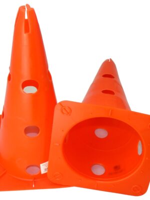 Pachołek treningowy z PCV z otworami wysokości 38 cm w kolorze czerwonym i żółtym.