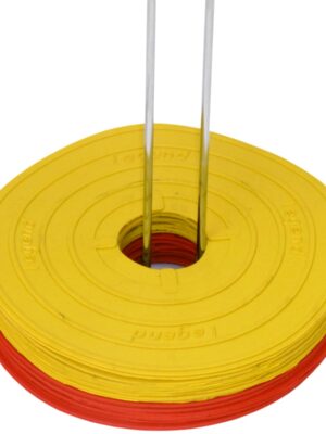 Wewnątrz talerzyka znajduje się otwór na tyczkę treningową maksymalnej średnicy 40 mm. W zestawie wraz markerami dostarczamy metalowe nosidełko pełniące funkcję stojaka. Markery gumowe o średnicy 16 cm służą do wytyczania torów przeszkód, boisk i pól treningowych na salach gimnastycznych.