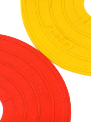 Zestaw 12 talerzyków gumowych o średnicy 16 cm w dwóch kolorach: 6 sztuk żółtych i 6 sztuk czerwonych.