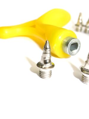 Zestaw kolców metalowych do butów biegowych długości 12 mm z kluczem.