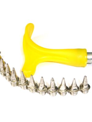Zestaw zawiera 16 sztuk wkrętów do butów lekkoatletycznych oraz klucz służący do wymiany kolców. Długość pojedynczego kolca wynosi 12 mm, a całego wkręta wraz z gwintem 16 mm. Średnica gwintu ma 5 mm.